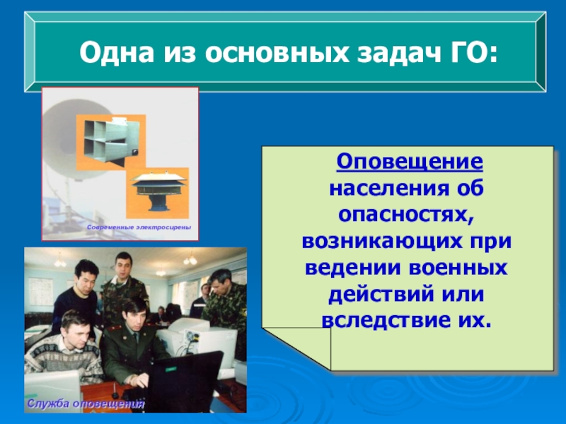 Одна из основных задач ГО: Оповещение населения об опасностях, возникающих при ведении военных действий или вследствие