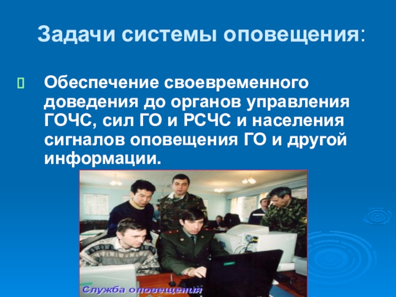 Задачи системы оповещения:Обеспечение своевременного доведения до органов управления ГОЧС, сил ГО и РСЧС и населения сигналов оповещения