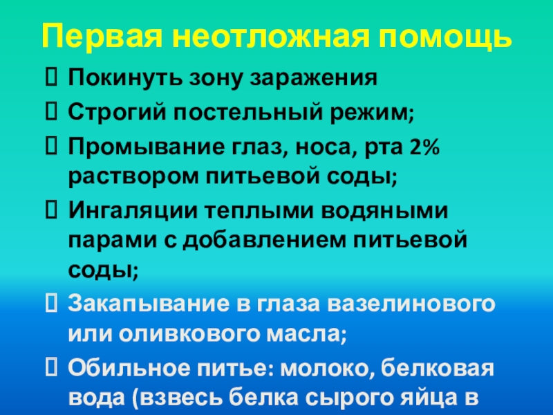 Давать пострадавшему пить подогретое молоко или минеральную воду без газа.