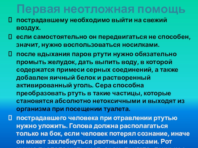 пострадавшего человека при отравлении ртутью нужно уложить. Голова должна располагаться только на бок, если человек потерял сознание, иначе он может захлебнуться рвотными массами. Рот нужно прополоскать раствором, приготовленным с добавлением бертолетовой соли.