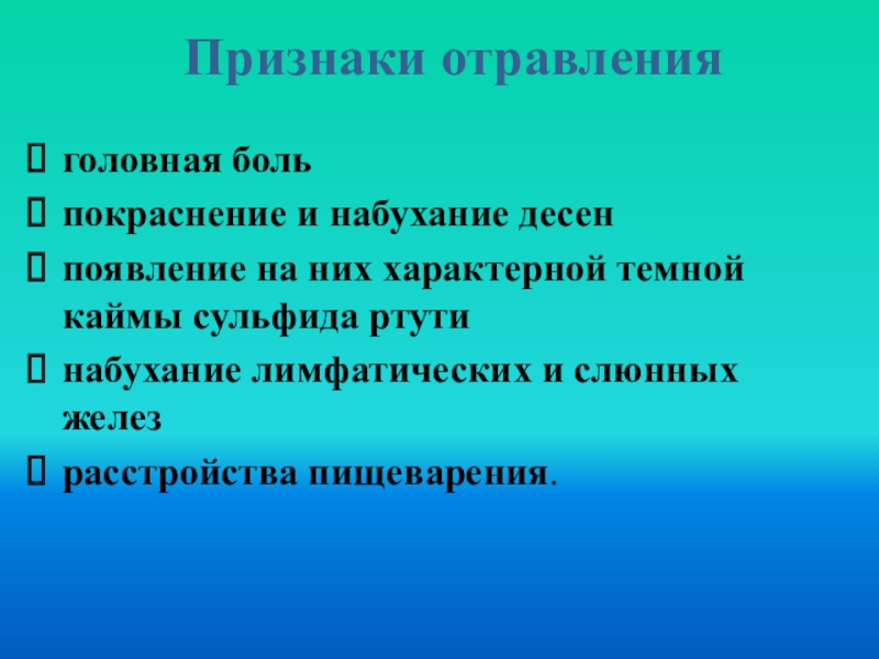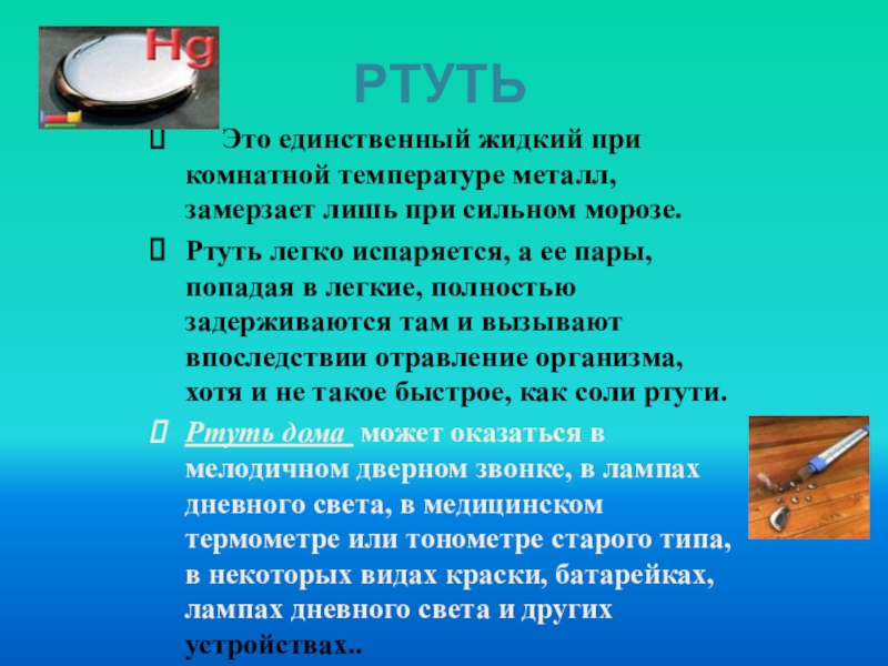Ртуть легко испаряется, а ее пары, попадая в легкие, полностью задерживаются там и вызывают впоследствии отравление организма, хотя и не такое быстрое, как соли ртути.