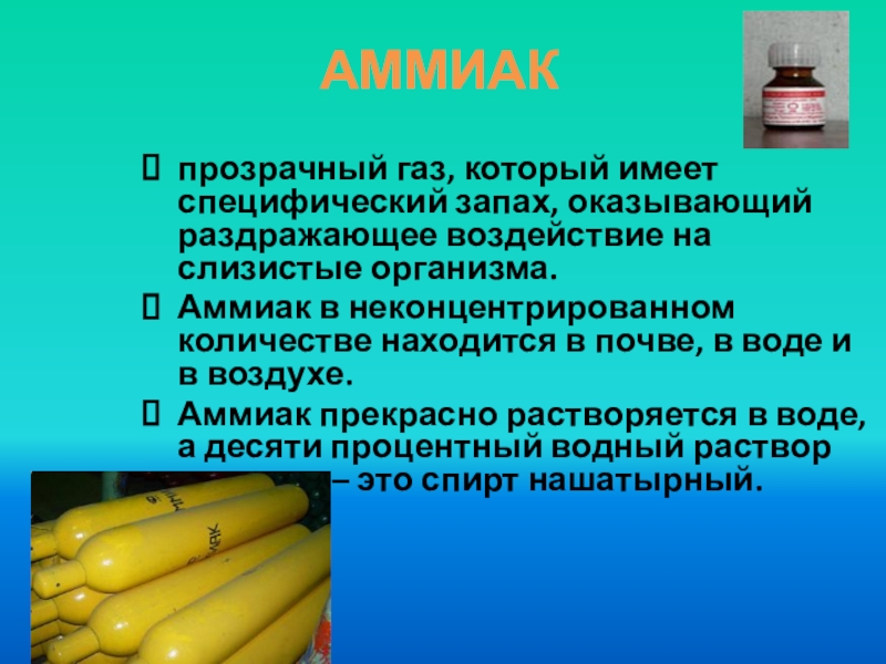 Аммиак в неконцентрированном количестве находится в почве, в воде и в воздухе.