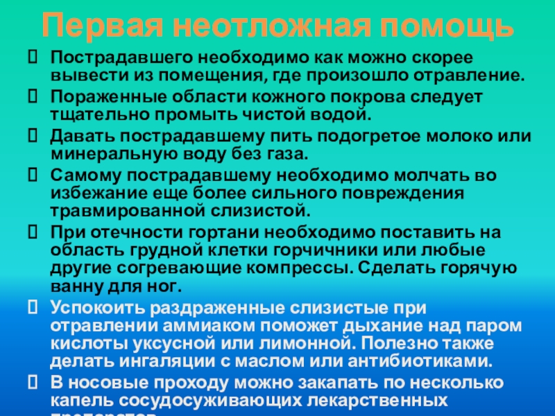 Успокоить раздраженные слизистые при отравлении аммиаком поможет дыхание над паром кислоты уксусной или лимонной. Полезно также делать ингаляции с маслом или антибиотиками.