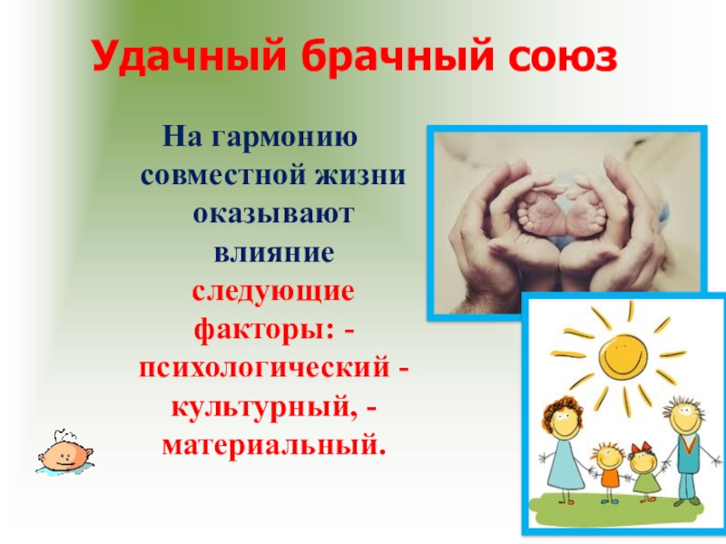 Удачный брачный союзНа гармонию совместной жизни оказывают влияние следующие факторы: -психологический -культурный, -материальный.