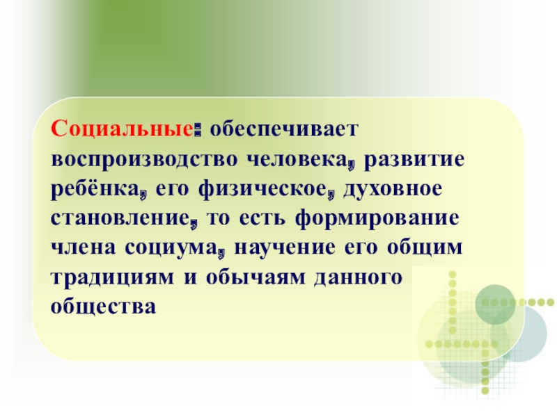 Слайд 11Социальные: обеспечивает воспроизводство человека, развитие ребёнка, его физическое, духовное становление, то