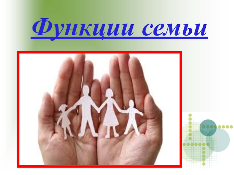 Социальные: обеспечивает воспроизводство человека, развитие ребёнка, его физическое, духовное становление, то есть формирование члена социума, научение его