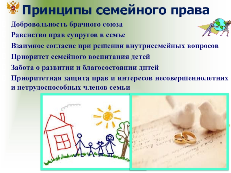 Принципы семейного праваДобровольность брачного союзаРавенство прав супругов в семьеВзаимное согласие при решении внутрисемейных вопросовПриоритет семейного воспитания детейЗабота