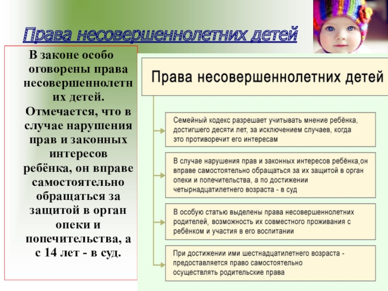 Права несовершеннолетних детейВ законе особо оговорены права несовершеннолетних детей. Отмечается, что в случае нарушения прав и законных