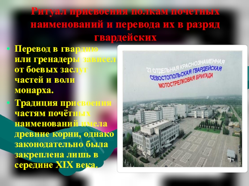 Слайд 5Ритуал присвоения полкам почетных наименований и перевода их в разряд гвардейских