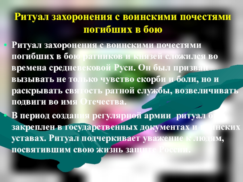 Слайд 15Ритуал захоронения с воинскими почестями погибших в бою