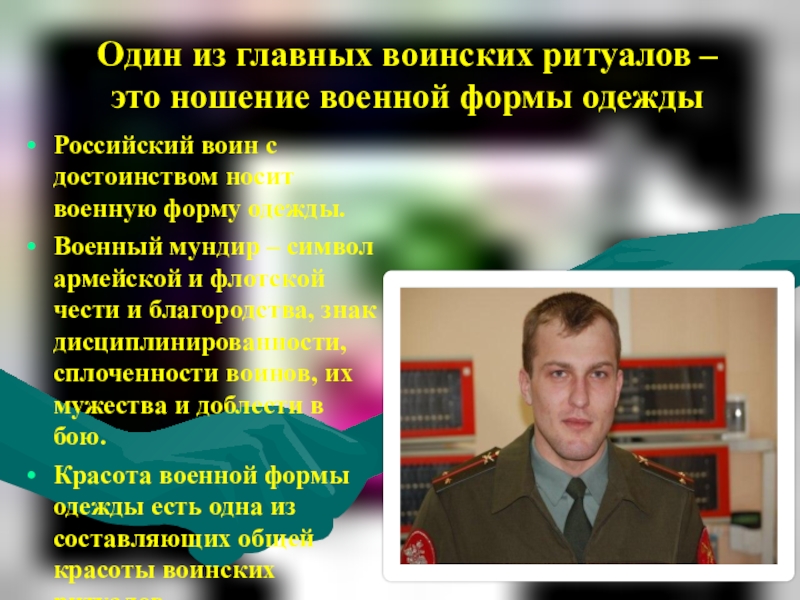 Воинский ритуал – это исторически сложившаяся форма поведения военнослужащих при совершении воинских обрядов, торжественных и траурных церемоний. Воинские ритуалы служат закреплению и распространению воинских традиций, воплощают в себе благородные идеалы мужества, стойкости и героизма, сочетают национальные и интернациональные традиции, воспитывают воина – патриота и интернационалиста.
