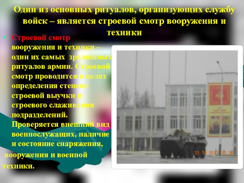 Слайд 11Один из основных ритуалов, организующих службу войск – является строевой смотр