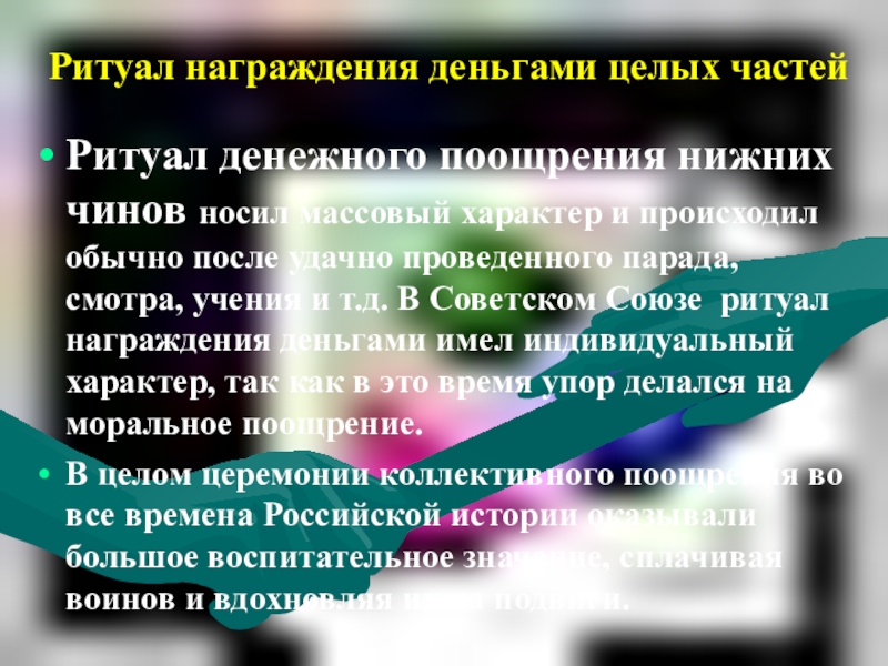 характер и происходил обычно после удачно проведенного парада, смотра, учения и т.д. В Советском Союзе ритуал награждения деньгами имел индивидуальный характер, так как в это время упор делался на моральное поощрение.