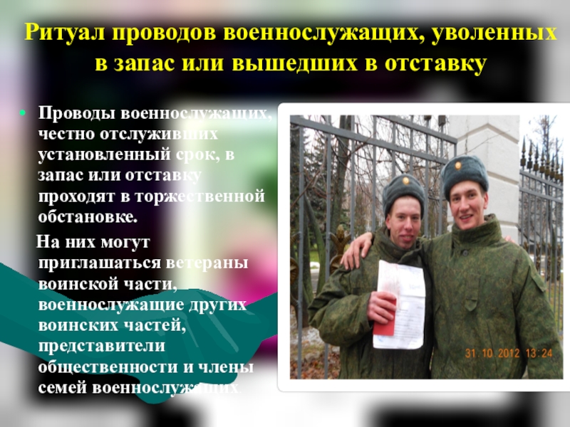 Слайд 14Ритуал проводов военнослужащих, уволенных в запас или вышедших в отставку