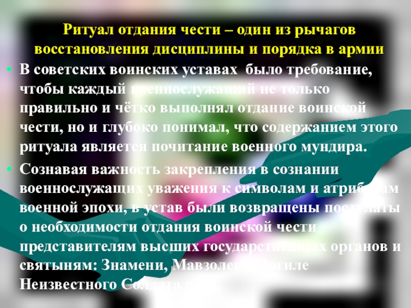 Слайд 10Ритуал отдания чести – один из рычагов восстановления дисциплины и порядка