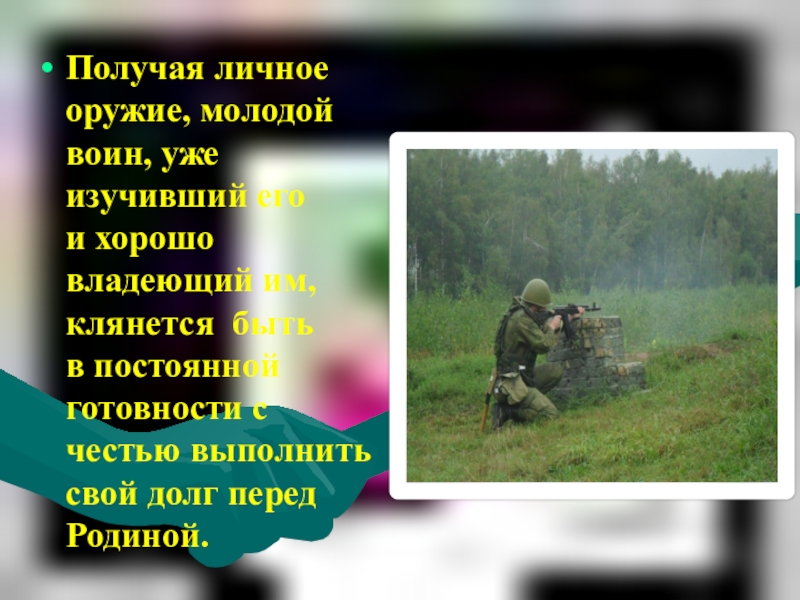 и хорошо владеющий им, клянется быть в постоянной готовности с честью выполнить свой долг перед Родиной.