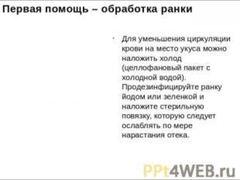 Презентация, доклад урока по ОБЖ на тему: Оказание ПМП при укусах змей и насекомых Урок 2 (6 класс)