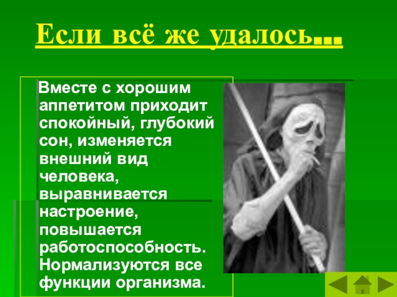 глубокий сон, изменяется внешний вид человека, выравнивается настроение, повышается работоспособность. Нормализуются все функции организма.