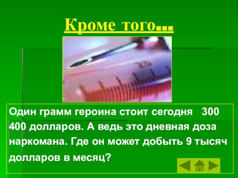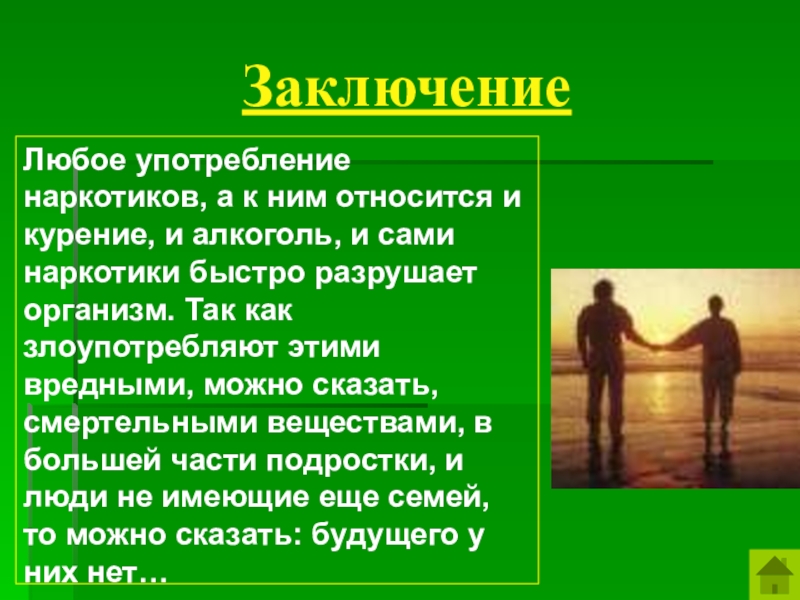 и сами наркотики быстро разрушает организм. Так как злоупотребляют этими вредными, можно сказать, смертельными веществами, в большей части подростки, и люди не имеющие еще семей, то можно сказать: будущего у них нет…