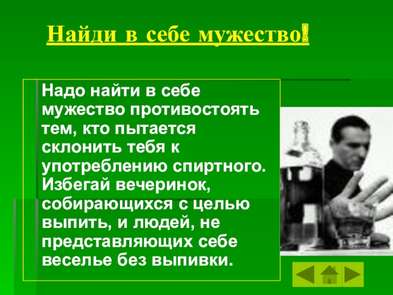 тем, кто пытается склонить тебя к употреблению спиртного. Избегай вечеринок, собирающихся с целью выпить, и людей, не представляющих себе веселье без выпивки.