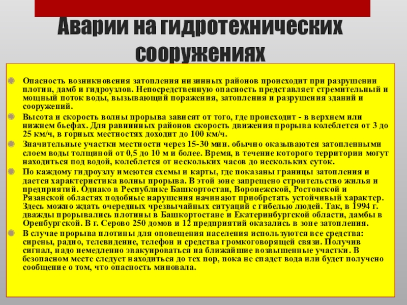 По каждому гидроузлу имеются схемы и карты, где показаны границы затопления и дается характеристика волны прорыва. В этой зоне запрещено строительство жилья и предприятий. Однако в Республике Башкортостан, Воронежской, Ростовской и Рязанской областях подобные нарушения начинают приобретать устойчивый характер. Здесь можно ждать очередных чрезвычайных ситуаций с гибелью людей. Так, в 1994 г. дважды прорывались плотины в Башкортостане и Екатеринбургской области, дамбы в Оренбургской. В г. Серово 250 домов и 12 предприятий оказались в зоне затопления.