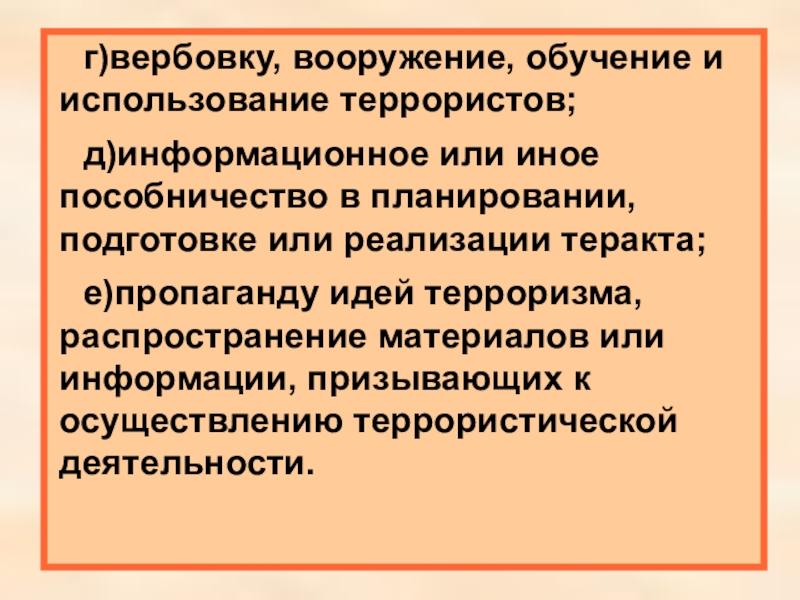 Слайд 8г)вербовку, вооружение, обучение и использование террористов;