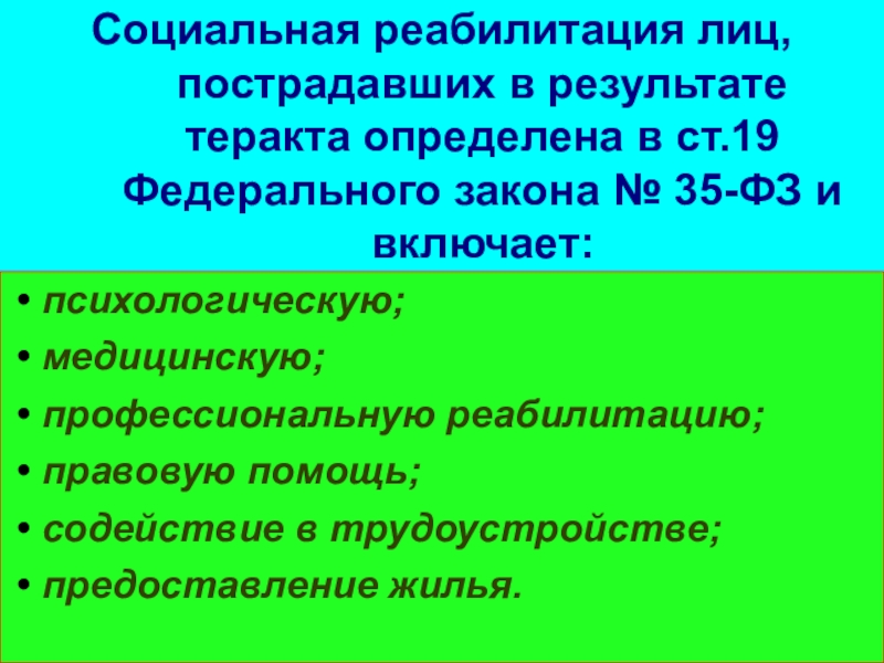 Слайд 19Социальная реабилитация лиц, пострадавших в результате теракта определена в ст.19 Федерального