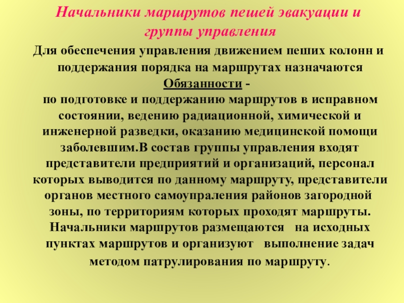 Слайд 29 Начальники маршрутов пешей эвакуации и