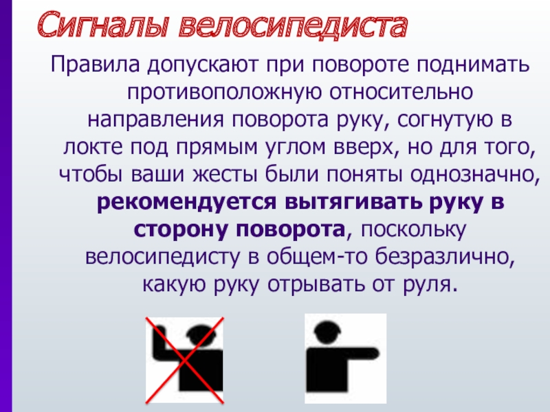 согнутую в локте под прямым углом вверх, но для того, чтобы ваши жесты были поняты однозначно, рекомендуется вытягивать руку в сторону поворота, поскольку велосипедисту в общем-то безразлично, какую руку отрывать от руля.