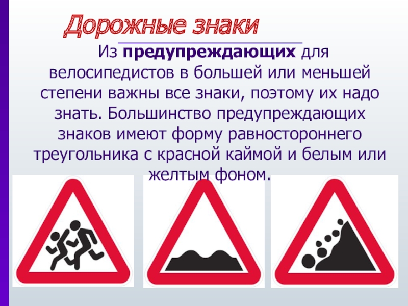 степени важны все знаки, поэтому их надо знать. Большинство предупреждающих знаков имеют форму равностороннего треугольника с красной каймой и белым или желтым фоном.