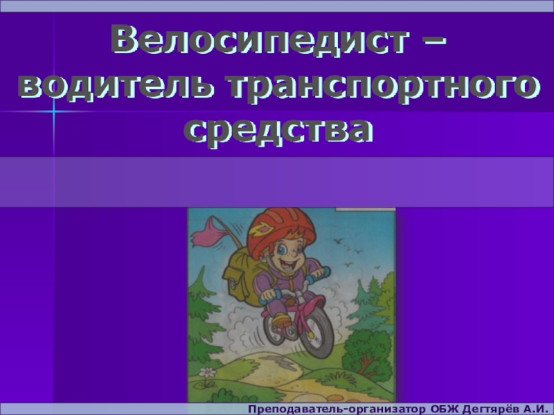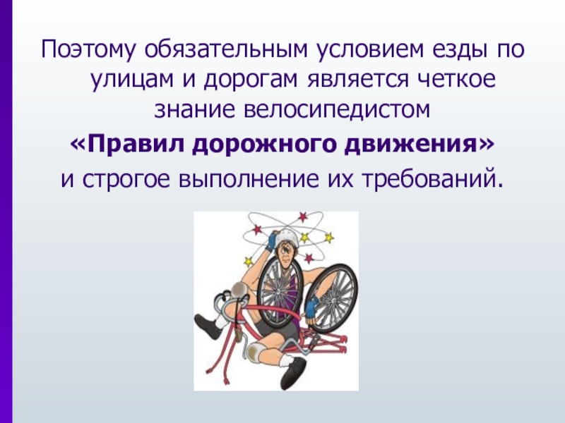 Велосипедист должен: хорошо знать правила дорожного движения, чтобы не стать виновником дорожно-транспортного происшествия и научиться отлично водить велосипед.