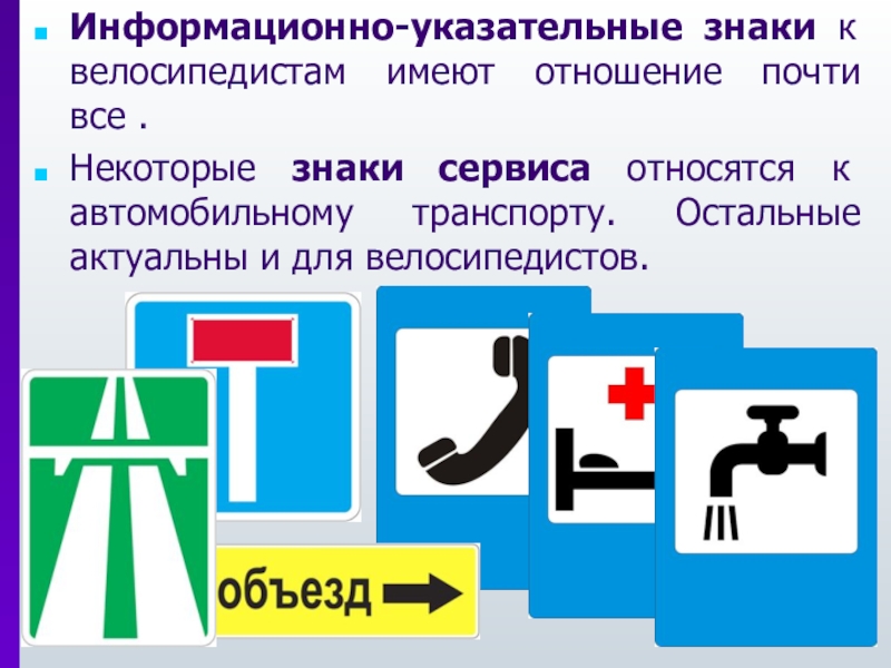 Слайд 20Информационно-указательные знаки к велосипедистам имеют отношение почти все .