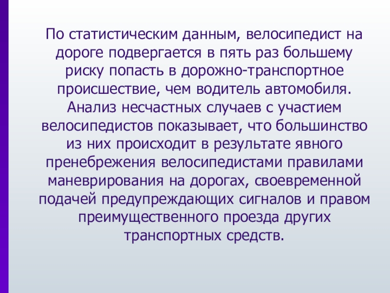 раз большему риску попасть в дорожно-транспортное происшествие, чем водитель автомобиля. Анализ несчастных случаев с участием велосипедистов показывает, что большинство из них происходит в результате явного пренебрежения велосипедистами правилами маневрирования на дорогах, своевременной подачей предупреждающих сигналов и правом преимущественного проезда других транспортных средств.