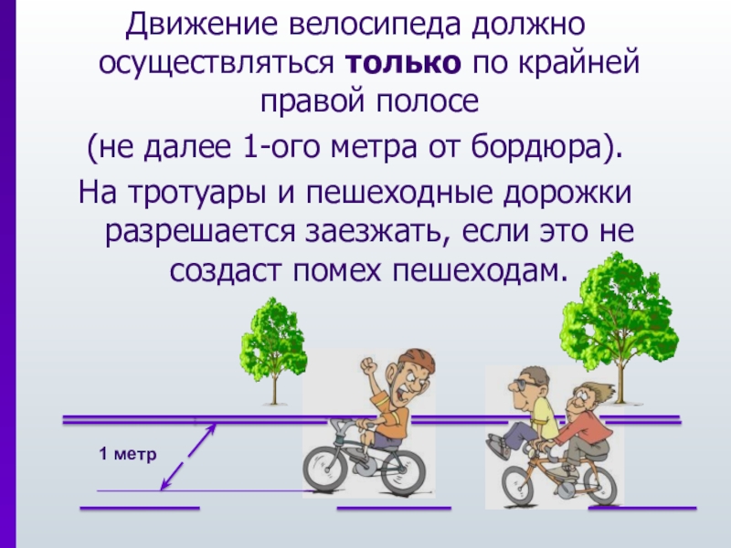 Слайд 7Движение велосипеда должно осуществляться только по крайней правой полосе