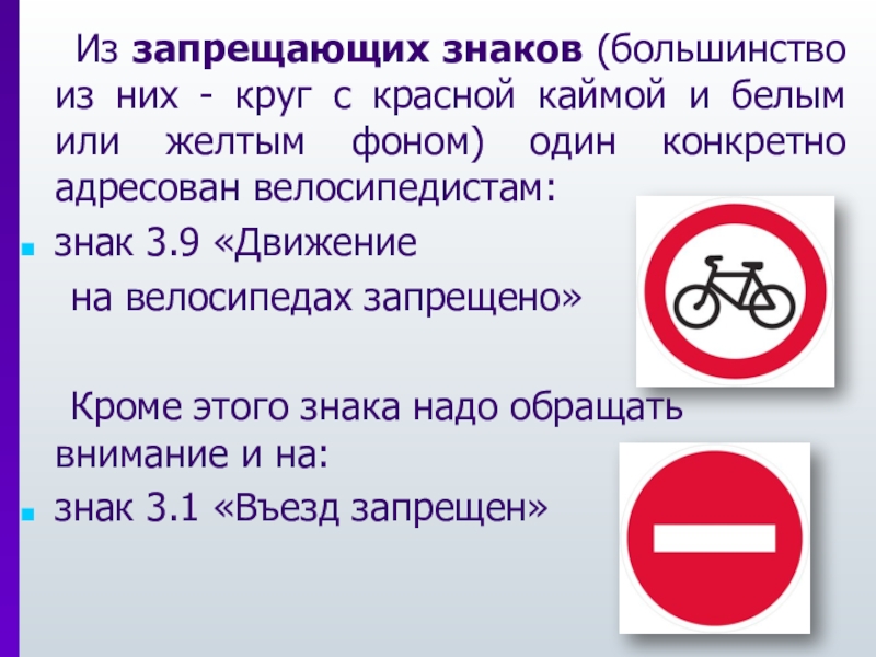 Слайд 16 Из запрещающих знаков (большинство из них - круг с