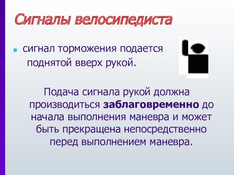 Велосипедист, предполагающий осуществить поворот или остановиться, должен подавать