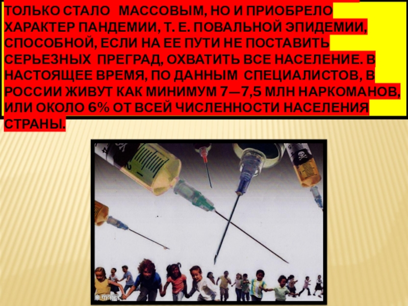 приобрело характер пандемии, т. е. повальной эпидемии, способной, если на ее пути не поставить серьезных  преград, охватить все население. В настоящее время, по данным  специалистов, в России живут как минимум 7—7,5 млн нарко­манов, или около 6% от всей численности населения страны.