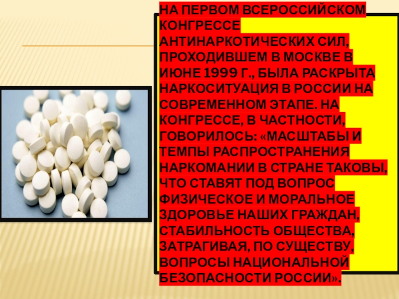 1999 г., была раскрыта наркоситуа­ция в России на современном этапе. На конгрессе, в частности, говорилось: «Масштабы и темпы распространения наркомании в стране таковы, что ставят под вопрос физическое и моральное здоровье наших граждан, стабильность общества, затрагивая, по существу, вопросы национальной безопасности России».