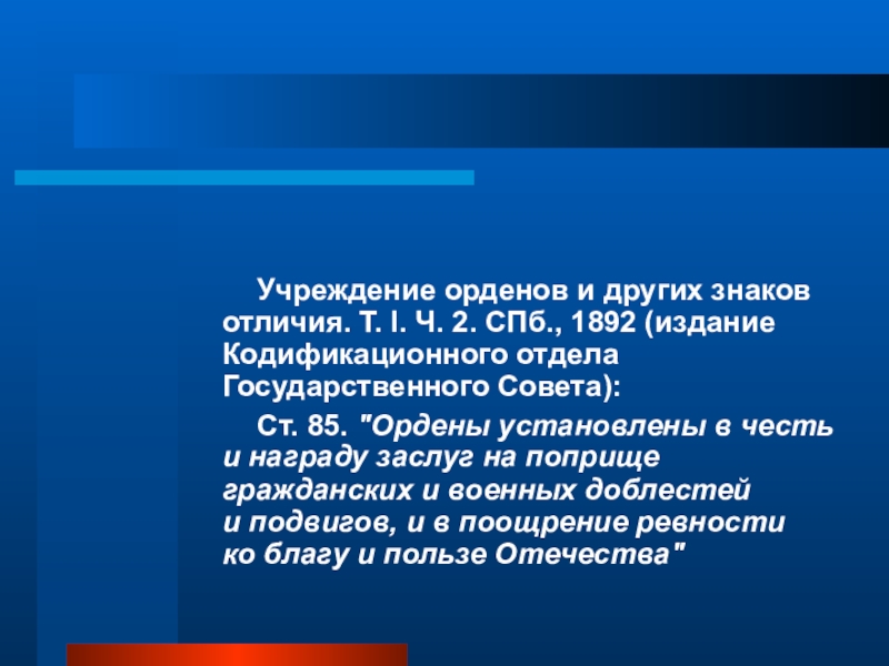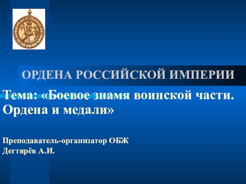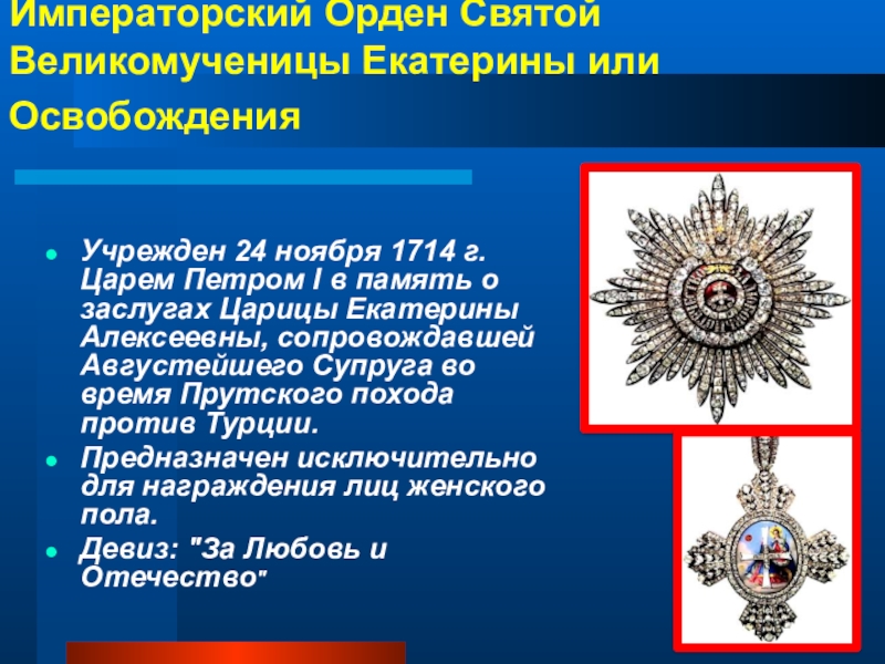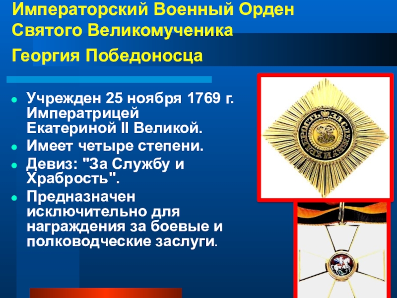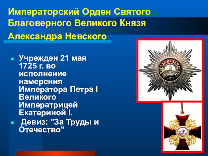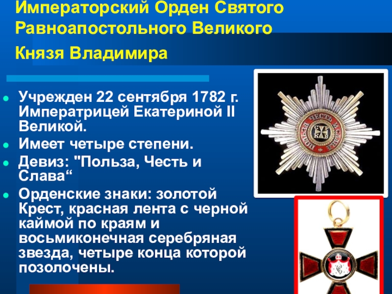 Орденские знаки: золотой Крест, голубая лента, восьмиконечная серебряная звезда и золотая цепь.