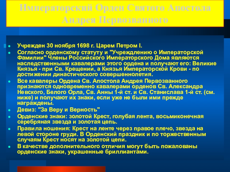 Все кавалеры Ордена Св. Апостола Андрея Первозванного признаются одновременно кавалерами орденов Св. Александра Невского, Белого Орла, Св. Анны 1-й ст. и Св. Станислава 1-й ст. (см. ниже) и получают их знаки, если уже не были ими прежде награждены.