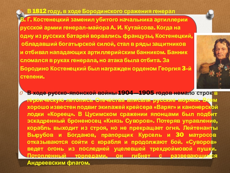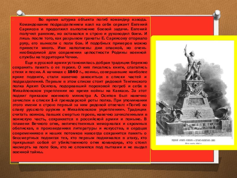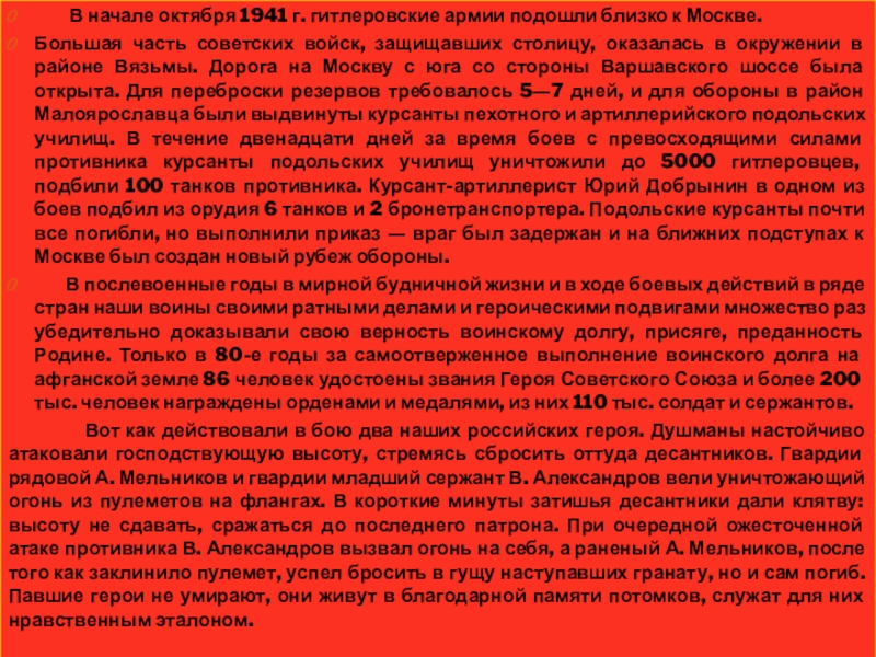 Военная история Отечества включает множество примеров героического поведения российский солдат и офицеров. Приведем некоторые из них.