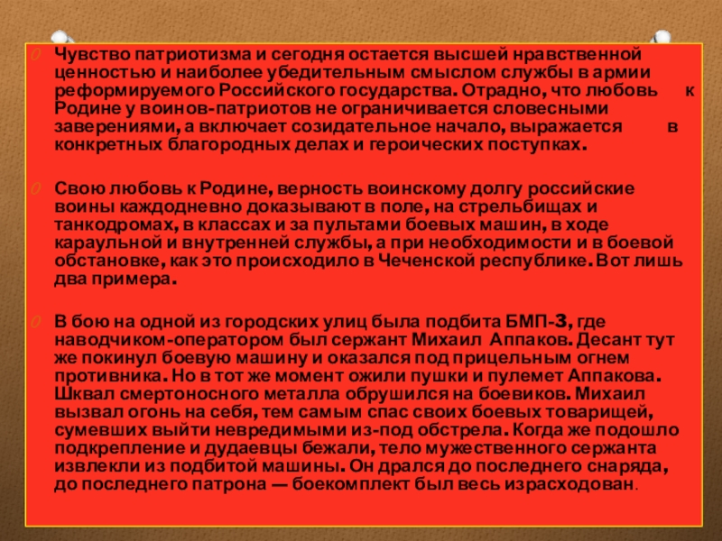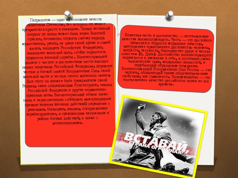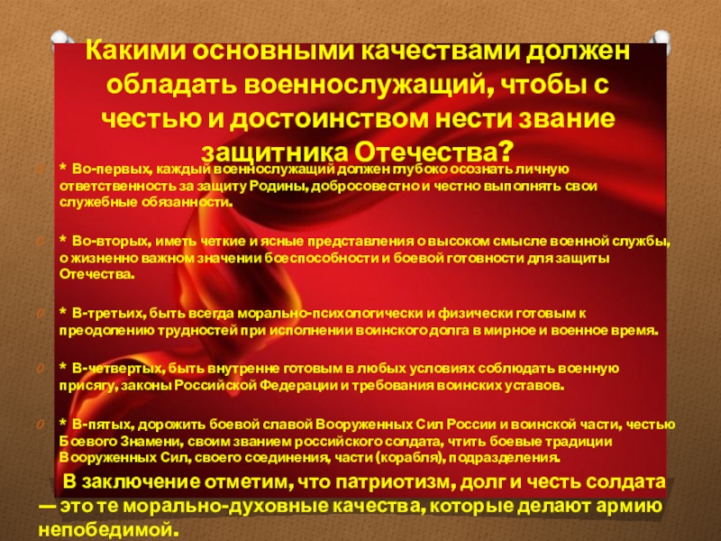 В заключение отметим, что патриотизм, долг и честь солдата — это те морально-духовные качества, которые делают армию непобедимой.
