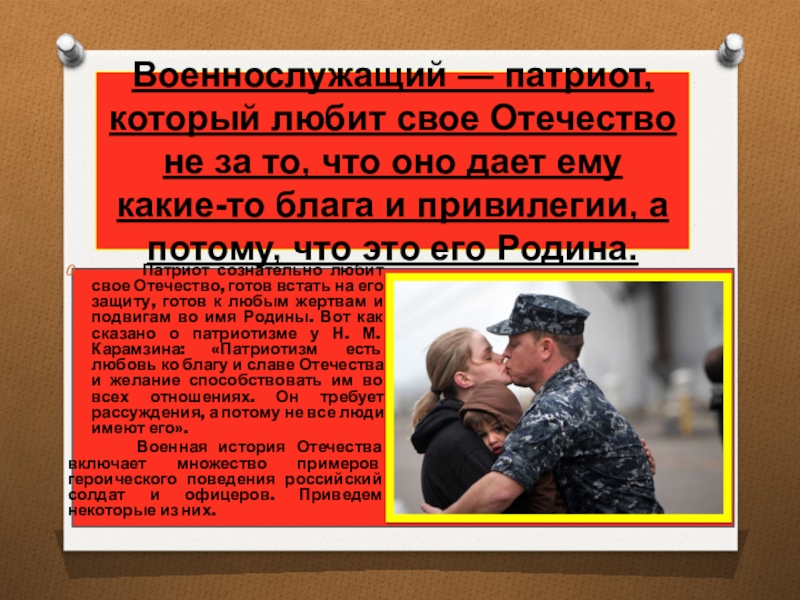 Патриот сознательно любит свое Отечество, готов встать на его защиту, готов к любым жертвам и подвигам во имя Родины. Вот как сказано о патриотизме у Н. М. Карамзина: «Патриотизм есть любовь ко благу и славе Отечества и желание способствовать им во всех отношениях. Он требует рассуждения, а потому не все люди имеют его».