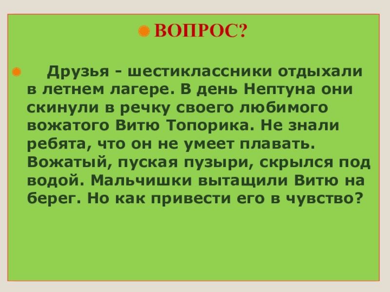 ВОПРОС?  Друзья - шестиклассники отдыхали в летнем лагере. В день Нептуна они скинули в речку своего