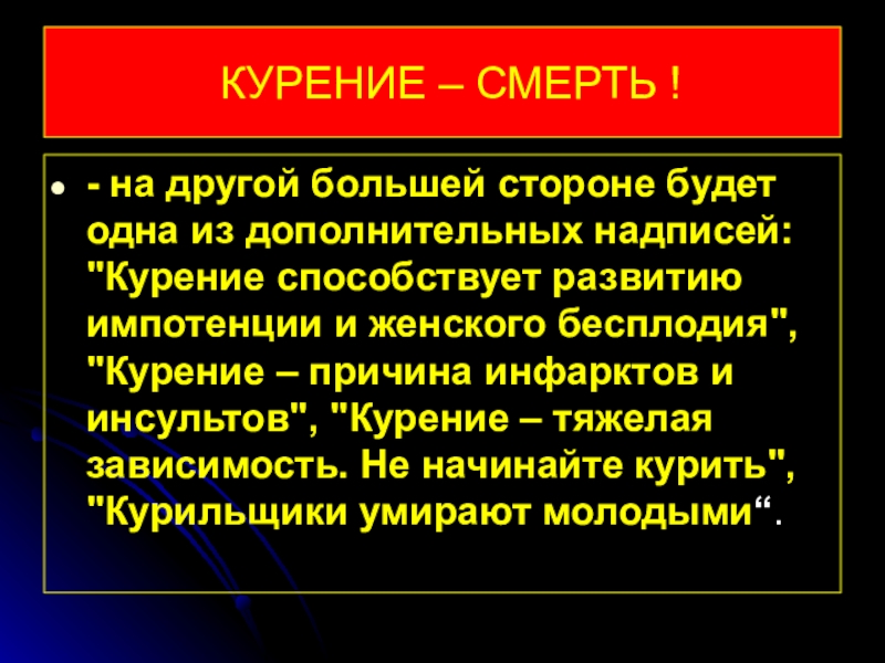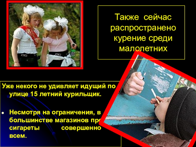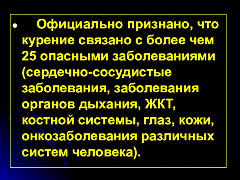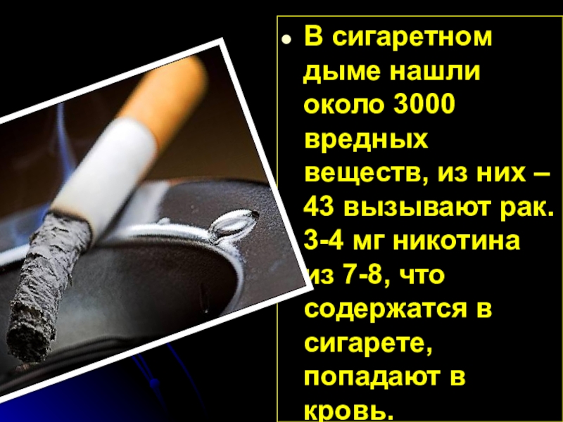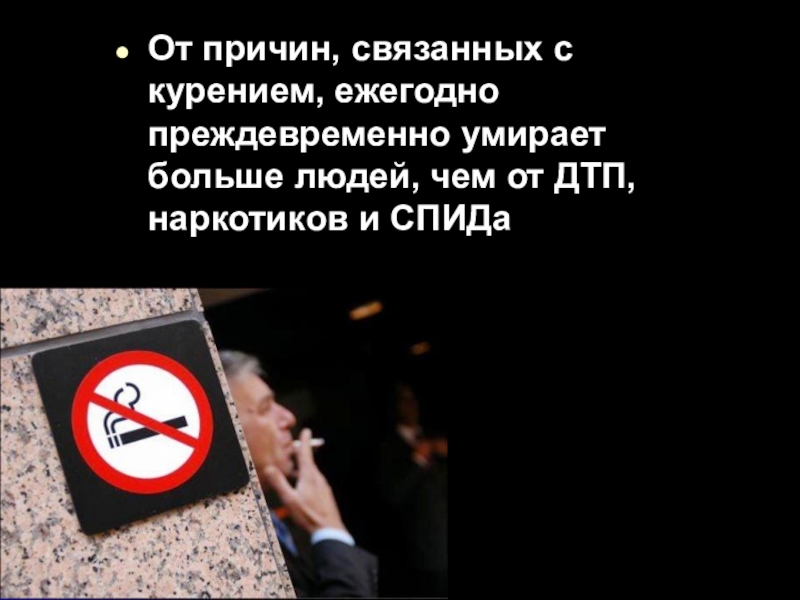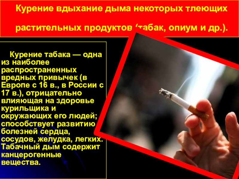 Курение табака — одна из наиболее распространенных вредных привычек (в Европе с 16 в., в России с 17 в.), отрицательно влияющая на здоровье курильщика и окружающих его людей; способствует развитию болезней сердца, сосудов, желудка, легких. Табачный дым содержит канцерогенные вещества.