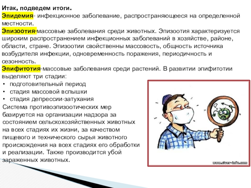 животных. Эпизоотия характеризуется широким распространением инфекционных заболеваний в хозяйстве, районе, области, стране. Эпизоотии свойственны массовость, общность источника возбудителя инфекции, одновременность поражения, периодичность и сезонность.
