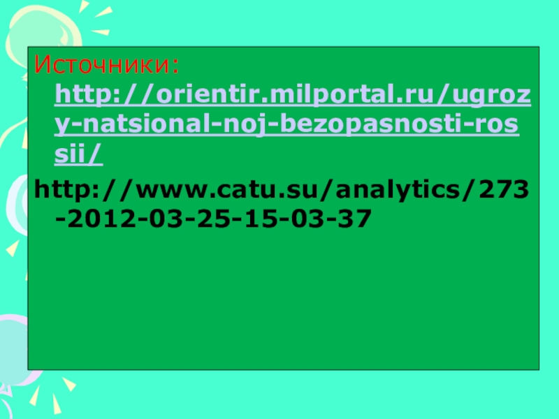Слайд 15Источники: http://orientir.milportal.ru/ugrozy-natsional-noj-bezopasnosti-rossii/