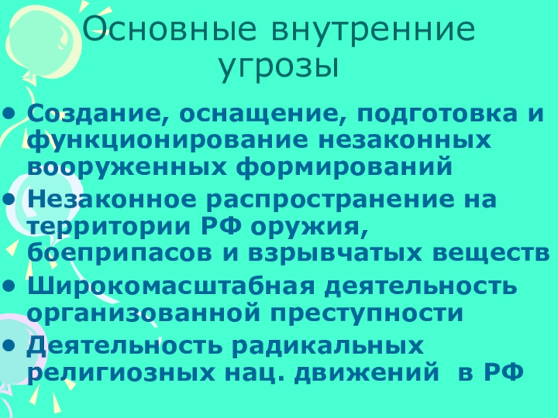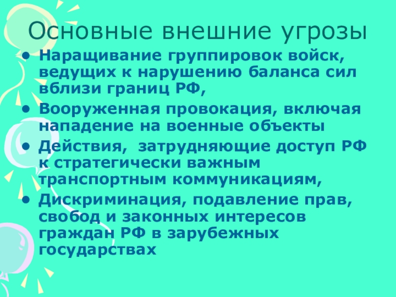 которые государство принимает по организации обороны, вытекают из существующих внешних и внутренних угроз национальной безопасности России.