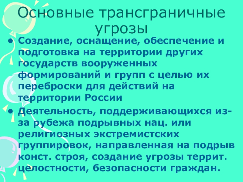 Деятельность, поддерживающихся из-за рубежа подрывных нац. или религиозных экстремистских группировок, направленная на подрыв конст. строя, создание угрозы террит. целостности, безопасности граждан.