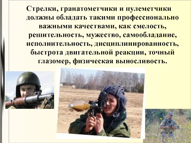 Стрелки, гранатометчики и пулеметчики должны обладать такими профессионально важными качествами,